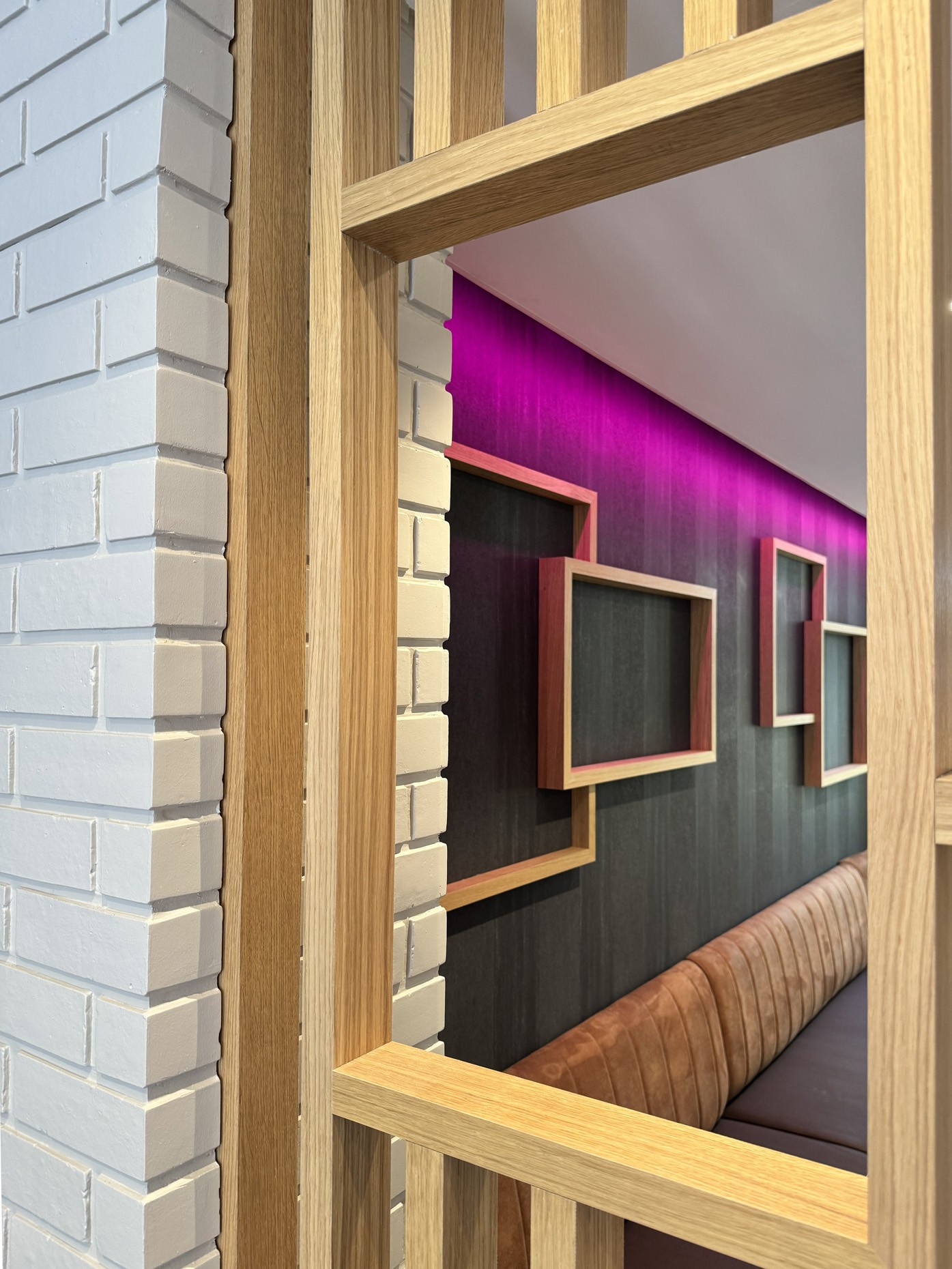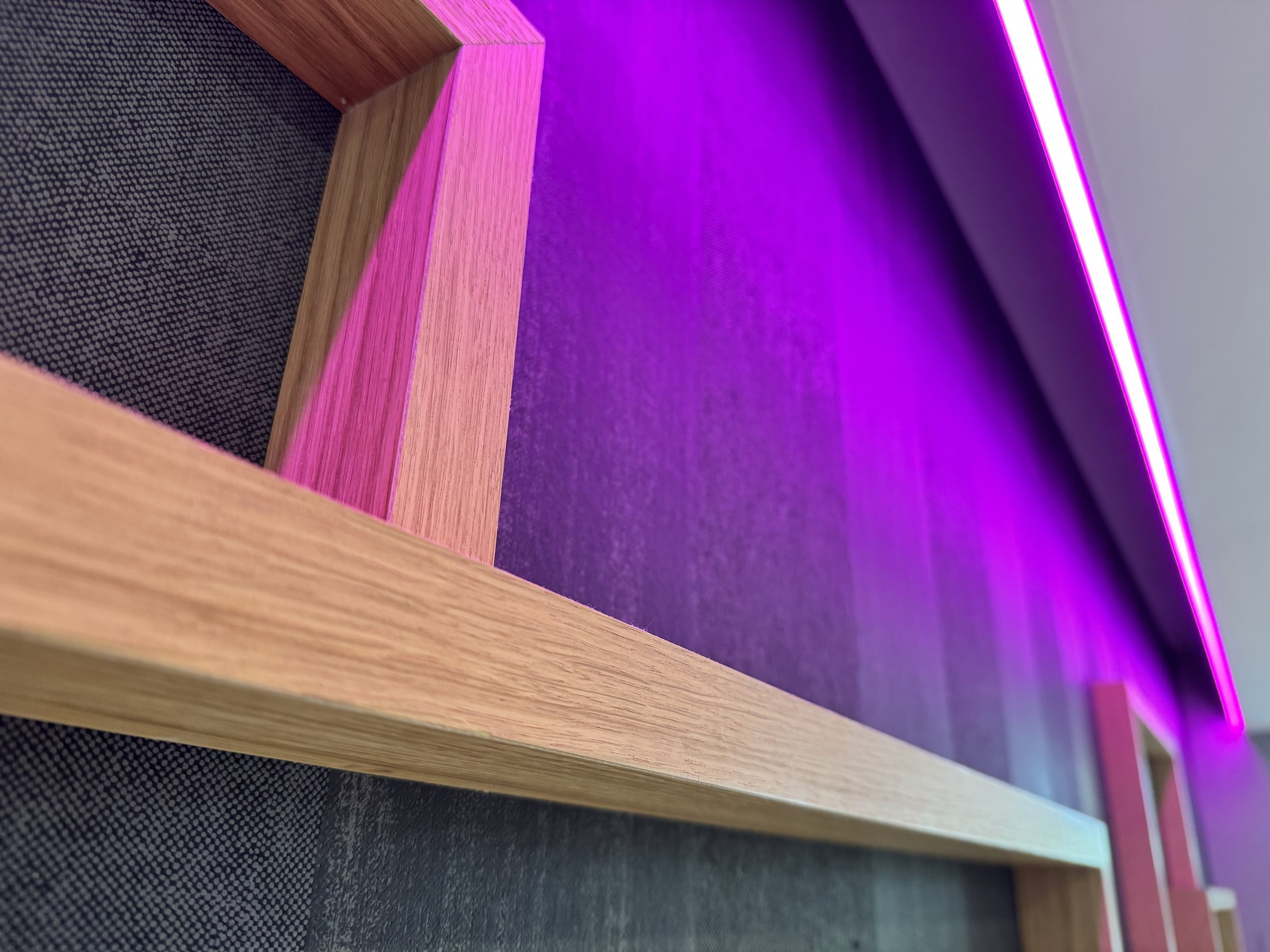 Éclairages LED sur cadres muraux : un éclairage LED est positionné sur l’ensemble du décor mural, mettant en évidence les cadres bois.