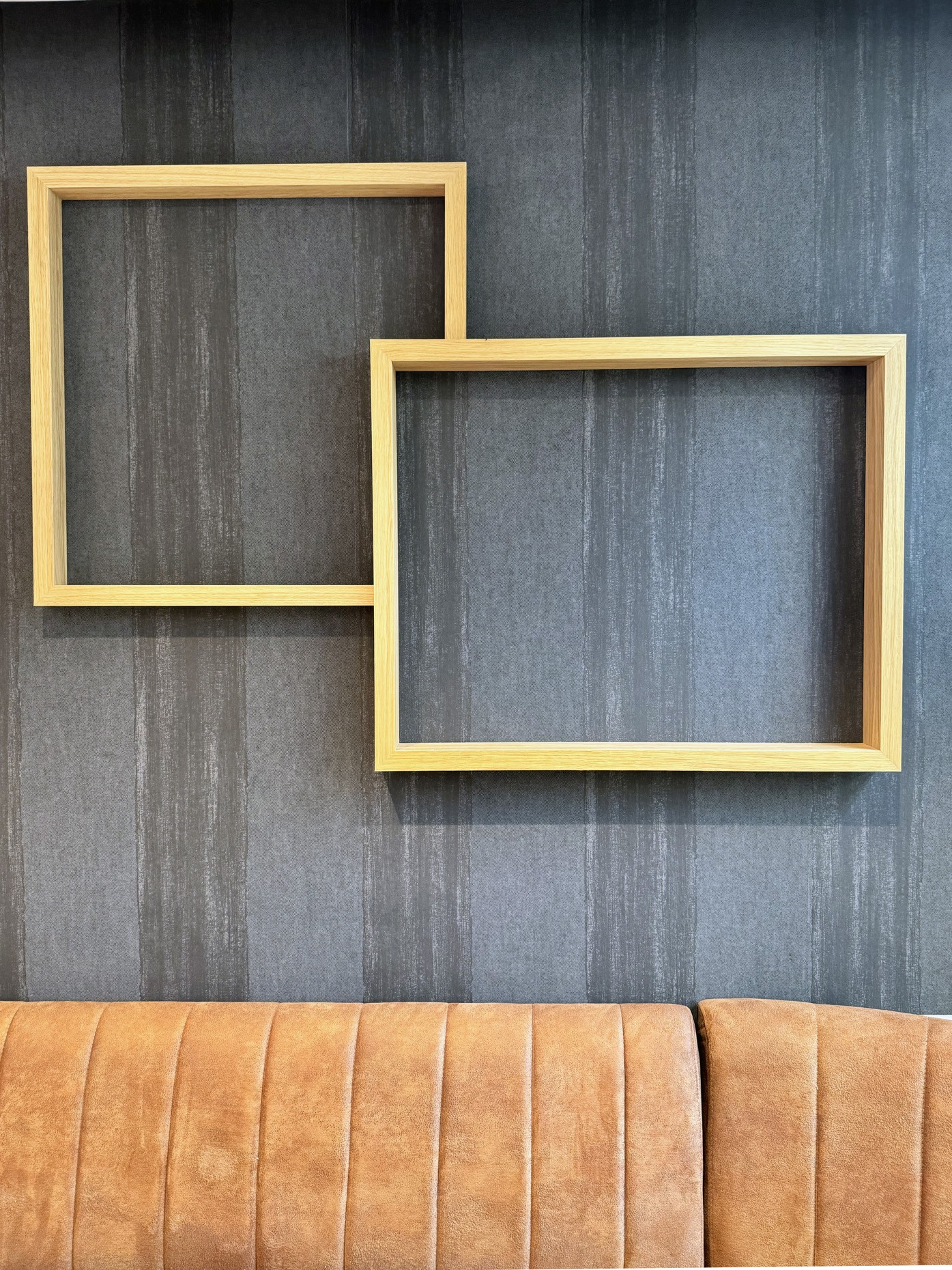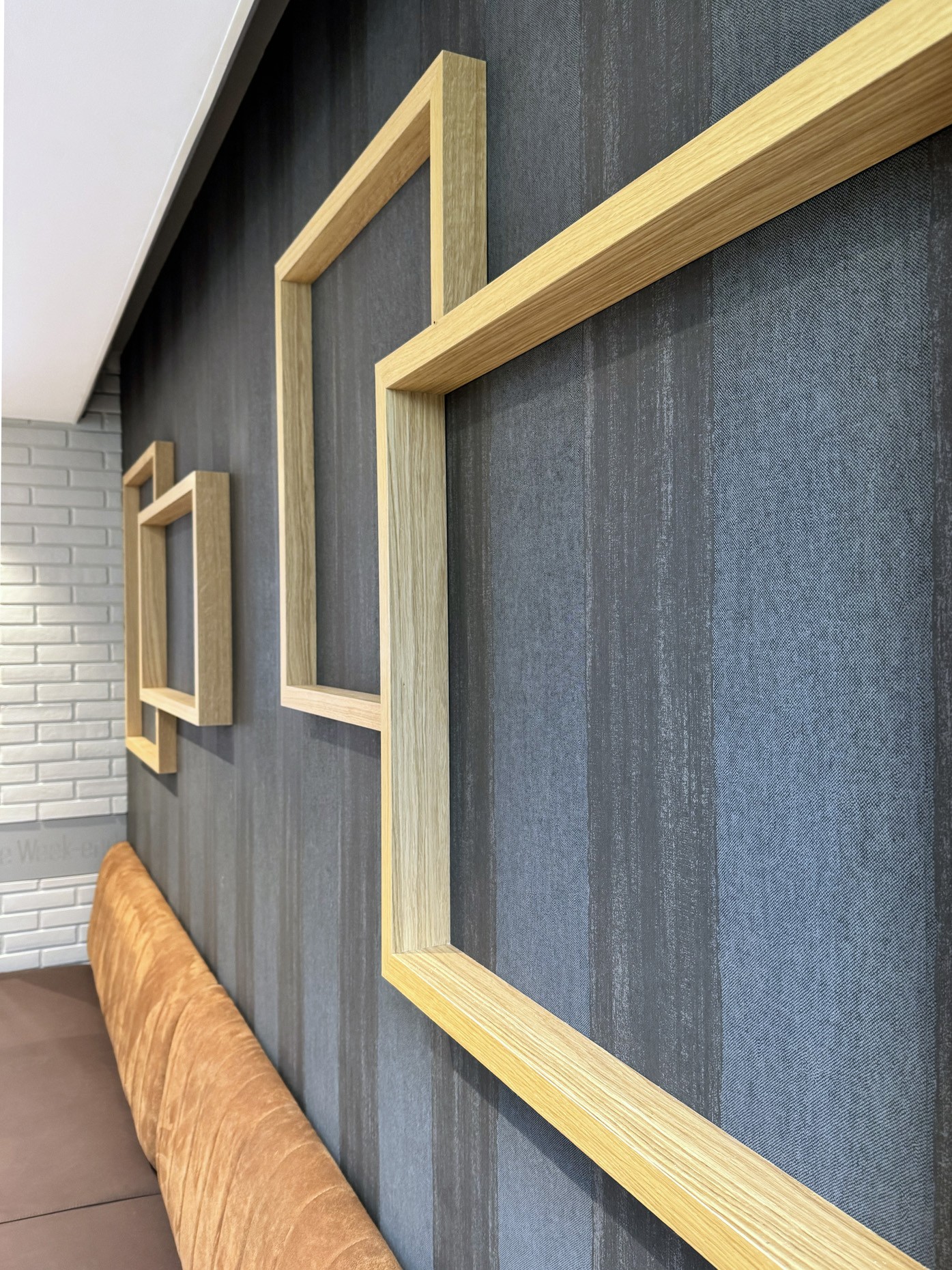 Un ensemble de cadres posés au mur réalisés en lames ASTRATA, posés directement sur un support papier peint de chez Flamant.