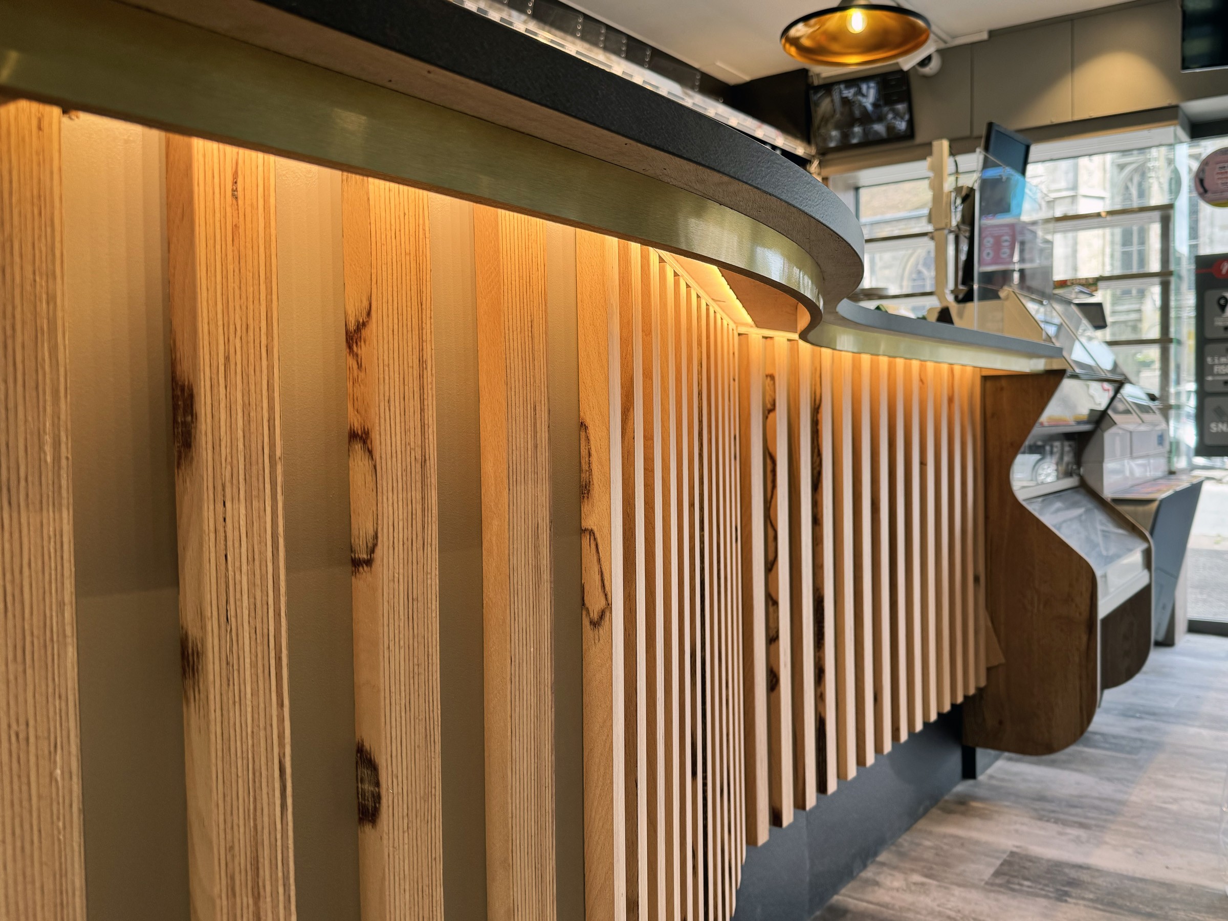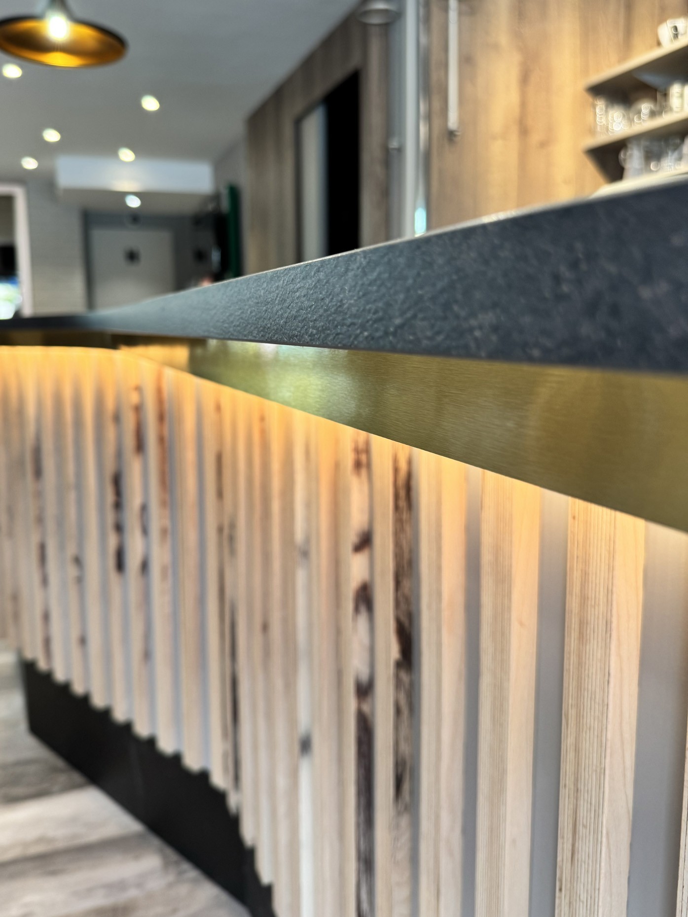 Habillage du comptoir bar, conçu avec des lignes courbes élégantes. Un éclairage led a été astucieusement positionné sous la bordure dorée mettant en évidence les lames de bois naturel en BAUBUCHE.
