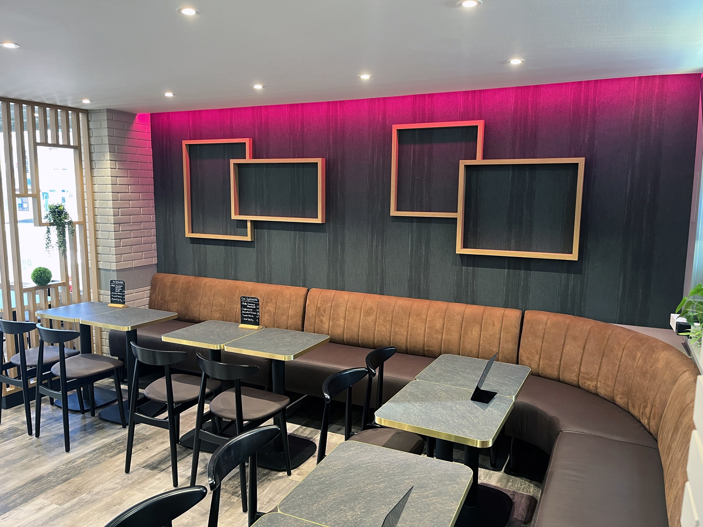 La salle arrière est équipée de banquettes en imitation cuir vieilli, l'angle de la pièce a été traité avec une banquette cintrée sur mesure.