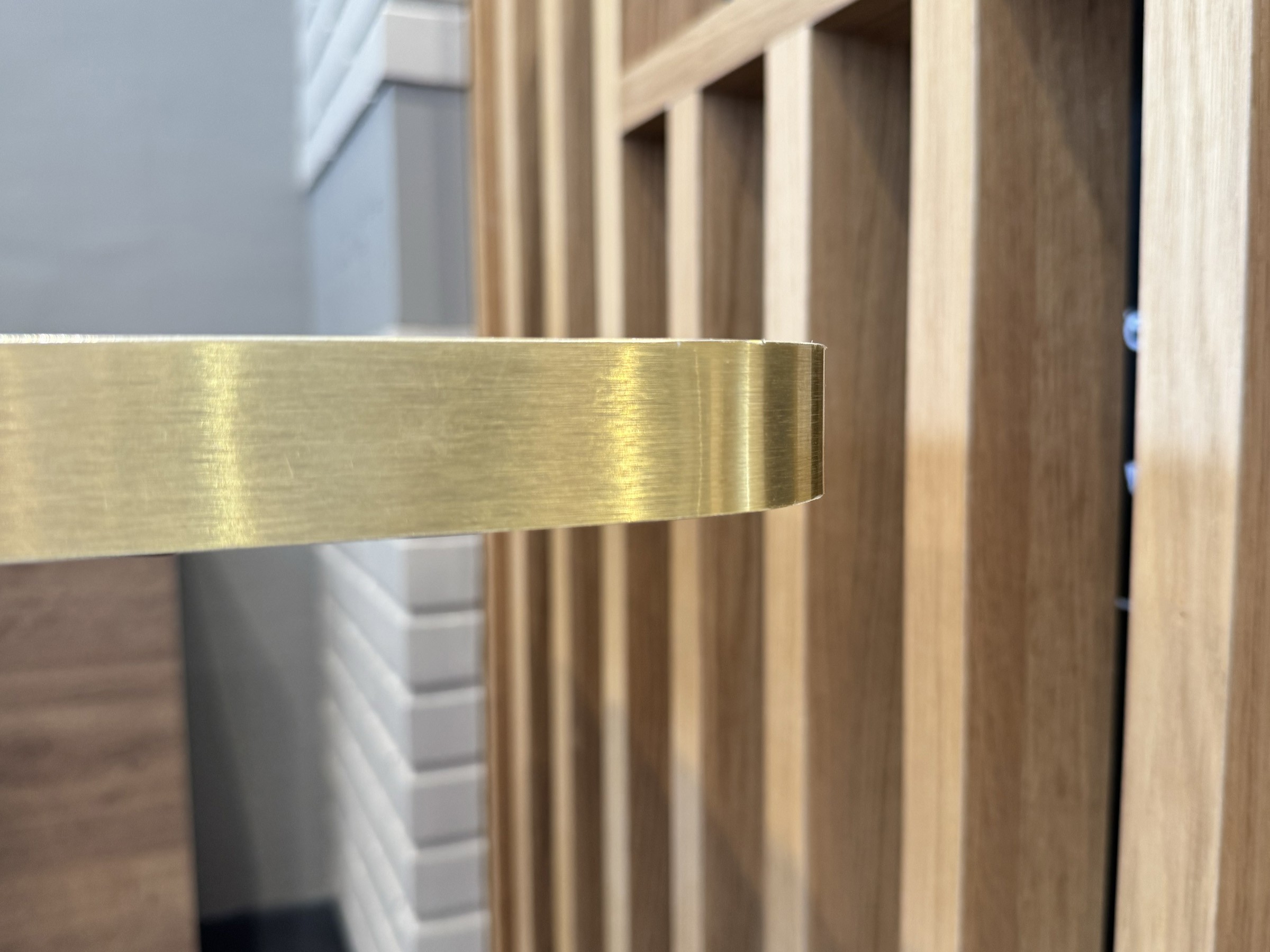 Les plateaux de tables ont été traités avec des angles arrondis et soulignés avec un chant doré pour un rendu visuel soigné.